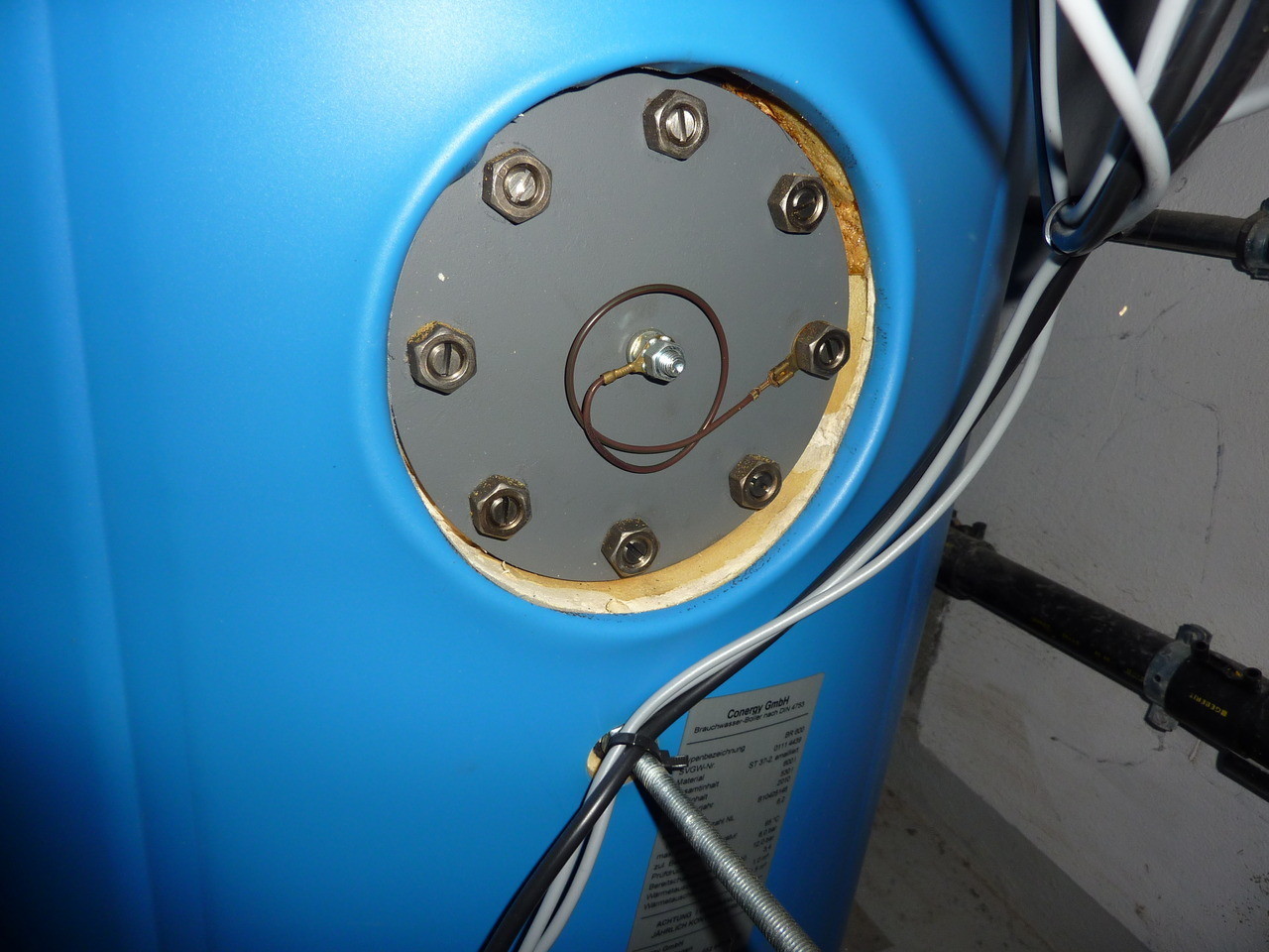Das Gerät wird waagrecht in ein 1 1/2" Gewinde eingedreht. Selbst wenn Ihr Boiler kein solches Gewinde hat, rentiert sich die Abklärung mit der Herstellerfirma. Für unseren Boiler ist ein Adapterflansch erhältlich. Für den Einbau sollte man den Boiler nicht einfach aufschrauben, 600 Liter heisses Wasser machen eine ziemliche Sauerei. Im Rahmen eines Entkalkungsservice z.B. lässt der Sanitär das Wasser aus dem Boiler und reinigt das Gerät vom Kalk. Bei dieser Gelegenheit kann der EGO Smart Heater auch gleich eingebaut werden. Der alte Flansch mit Schutzanode wird ausgebaut.