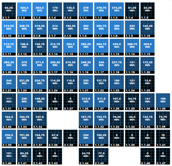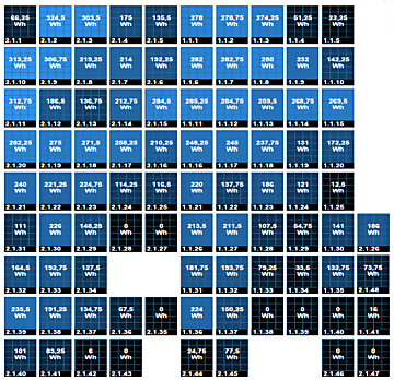 Die beiden Strings sind je vom Ost zum Westdach geführt. In den beiden Lücke liegt je ein Kamin, dessen Schatten während dem Tag über die umliegenden Module wandert. Der grösste Produktionsabfall ist bei Modul 2.1.39 zu sehen. Der zweite Kamin zeigt nur am Abend bei schwacher Sonne bei Modul 1.1.39 einen Produktionsabfall. Selbst beim gleichmässig besonnten Ostdach sind Unterschiede von 15% sichtbar (2.1.11 zu 1.1.5).
