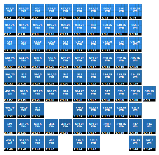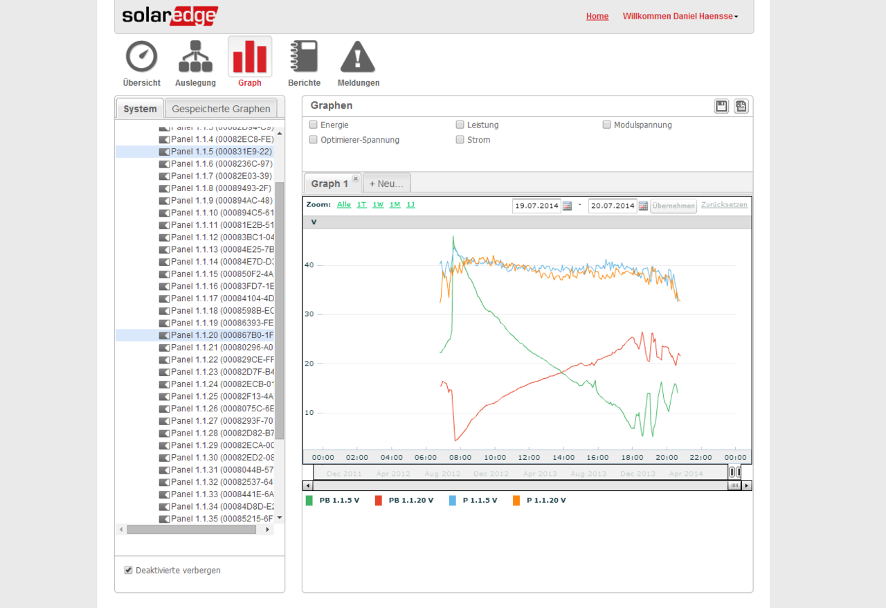 Das Dach ist ein Ost-West Dach, wobei die oberen drei Reihen auf dem Ostdach liegen und die restlichen Module auf dem Westdach. Die Leistungsoptimierer wandeln die momentane Leistung der Module optimal um. Panel 1.1.5 liegt auf dem Ostdach und Panel 1.1.20 auf dem Westdach. Um den Strom im String für jedes Modul im String gleich zu halten, wird die Spannung angepasst. Die Spannung der Module ist im Tagesverlauf kleineren Schwankungen ausgesetzt (Sonnenaufgang, Mittagshitze, Sonnenuntergang, Farben Blau und Orange). Die Leistungsoptimierer Spannung (P=U * I) passt sich der Leistungsabgabe des Moduls an, Ostdach am Vormittag hohe Spannung (Grün), Westdach am Nachmittag hohe Spannung (Rot)