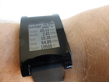 Die Leistungsdaten der Anlage lassen sich im Regelfall auch per Smartphone jederzeit von überall abrufen. Für Solaredge sind Apps für Android und iPhone verfügbar. Einfach im Store nach Solaredge suchen. Natürlich gibt es auch für die Pebble Uhr eine App.